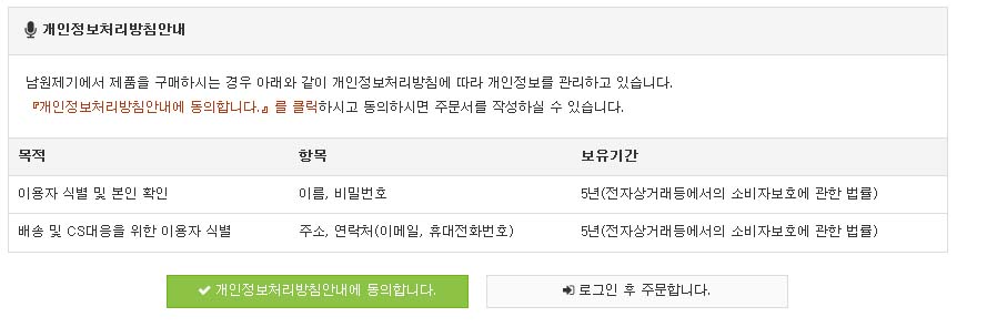 만약 회원에 가입하지 않은 비회원일 경우 아래와 같이 [개인정보처리방침안내] 문구가 보일 것입니다. 밑에 녹색 바탕의 "개인정보처리방침안내에 동의합니다."를 클릭하여 동의하시면 주문서를 작성하실 수 있습니다.
